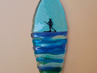 Fused glass plaques in shape of paddle boards depicting paddle boarders